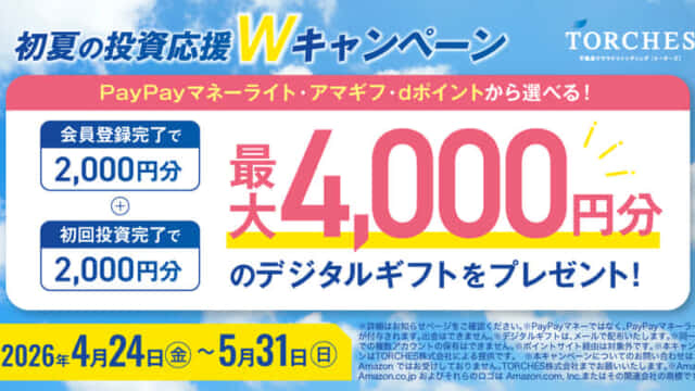 投資型クラファン 【実質利回り80%!?】TORCHES(トーチーズ)が狂いすぎてるキャンペーンを実施してるぞ!! 2026年3月17日 メカニック 不動産投資型クラウドファンディングのTORCHES(トーチーズ)の勢いが止まりません。 口座開設者数が右肩上がりで伸びているよ …