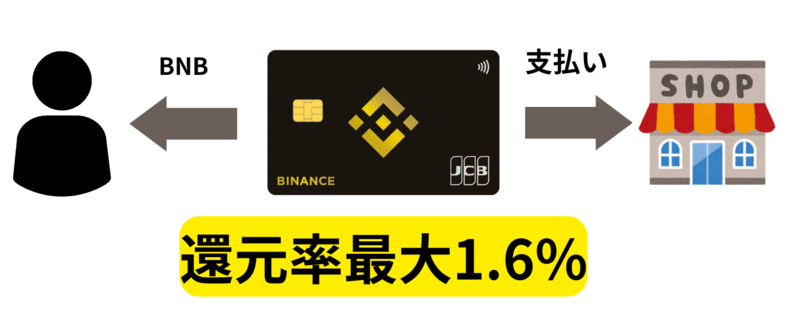 最大の魅力は1.6%という業界最高水準の還元率で、利用額に応じて暗号資産BNBが直接付与されます。