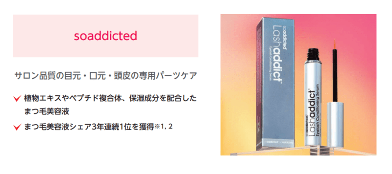 ラッシュディティクトというまつ毛美容液やスピケアというファンデーションが主力製品です。