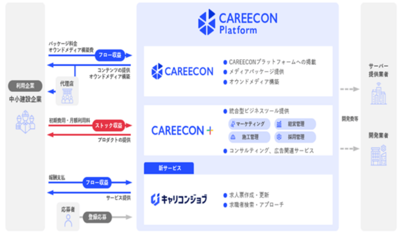 具体的には建設マッチングメディアである「CAREECON」と総合型ビジネスツール「CAREECON Plus」からなる「CAREECON Platform」を提供しています。