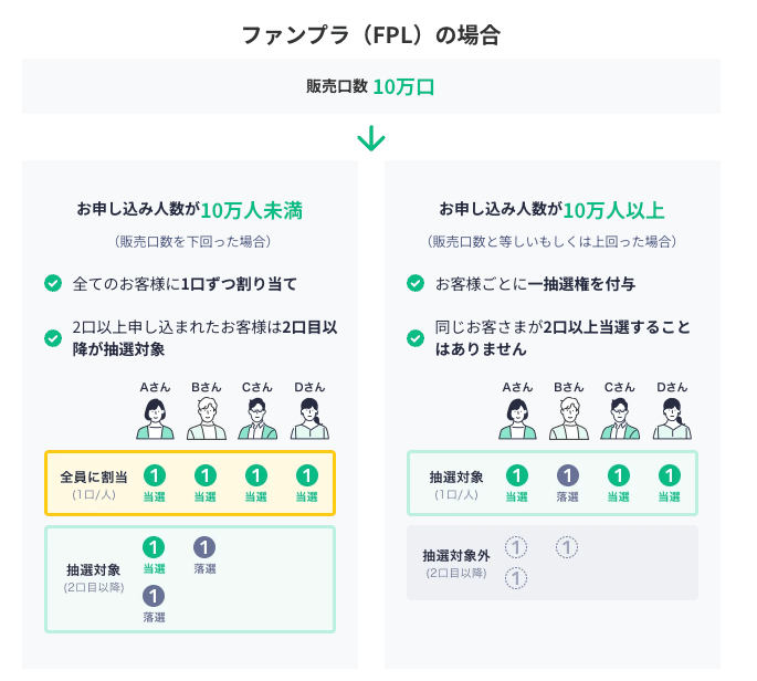 販売口数が申込人数と等しい、もしくは上回った場合はユーザー1人毎に1抽選権が付与され、2口以上当選することはありません。