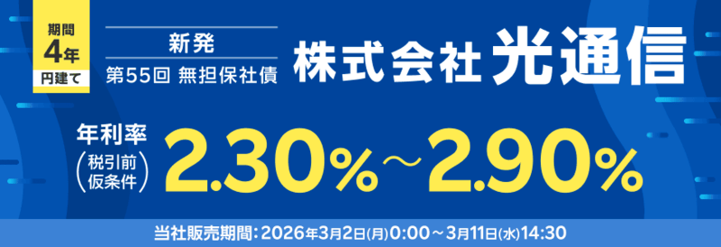 光通信 第55回無担保社債の利回りは2026/2/27に決定予定です。