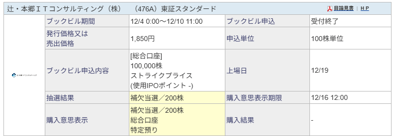 辻・本郷ITコンサルティングのIPO抽選結果