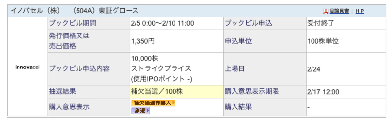 イノバセルのIPO抽選結果