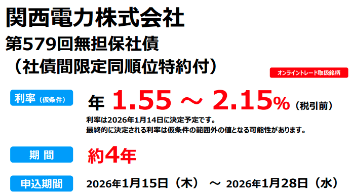 関西電力株式会社第579回無担保社債は関西電力株式会社が発行する個人投資家向けの社債です。