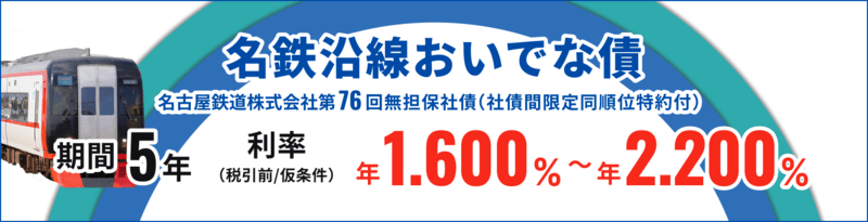 そこで今回は「名古屋鉄道株式会社第76回無担保社債」について利率、リスク、期間について紹介したいと思います。