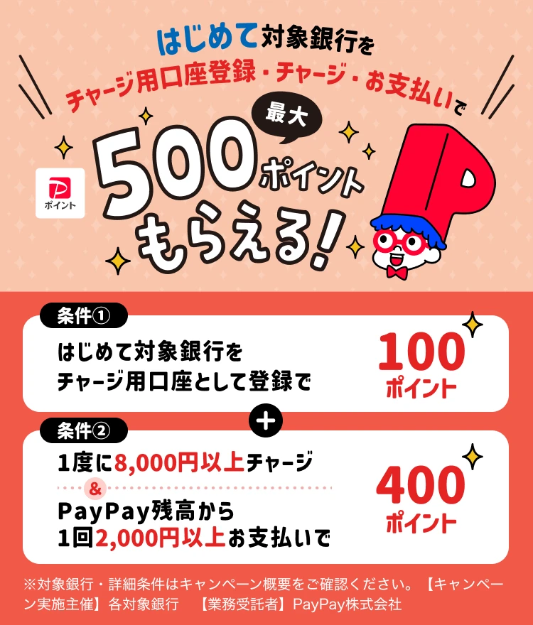 さらに1度に8,000円以上チャージしてPayPay残高から1回2,000円以上支払いすると400P貰えます。