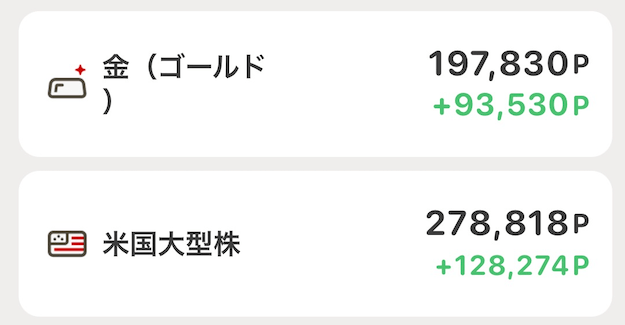 現在はお試しとしてテーマ投資の「米国大型株」に150,000P、「金」に104,300Pを投資しています。
