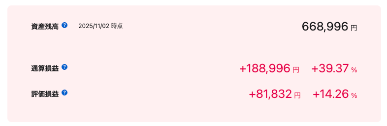 長期投資前提ですので、短期間での成績はあまり気にしていませんがやはり含み益だと嬉しいものです。