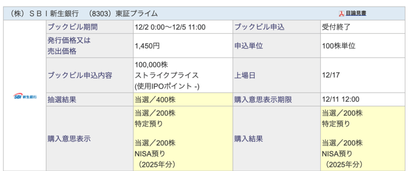 ついに12月の超目玉「SBI新生銀行」の抽選結果が判明しました。