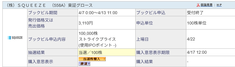 SQUEEZE、SBI主幹事だと気づかずipoポイント使ってしまいましたが、おかげで300株も当選しました。