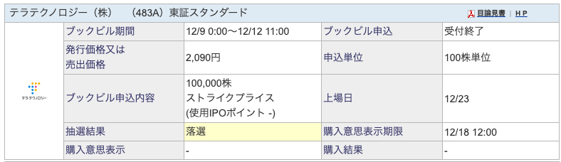 そして初めてポイント使って申し込みしたテラテクノロジーは補欠当選 pic.twitter.com/iLBuUm4Lac