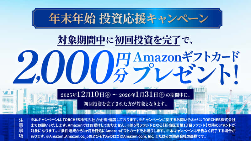 2025年12月10日から1月31日までの間に初回投資した人にアマゾンギフトカード2,000円分がプレゼントされます。