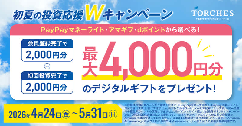 それではTORCHES(トーチーズ)で実施中の初夏の投資応援キャンペーンを紹介します。