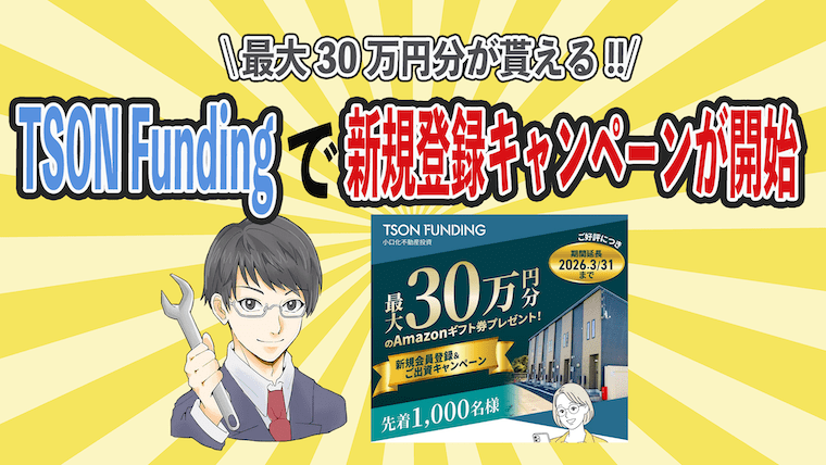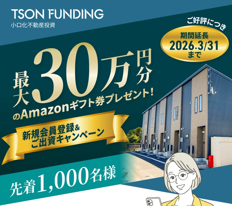 不動産投資型クラウドファンディングTSON FUNDINGで最大30万円分のアマギフをキャンペーンが開始されました。